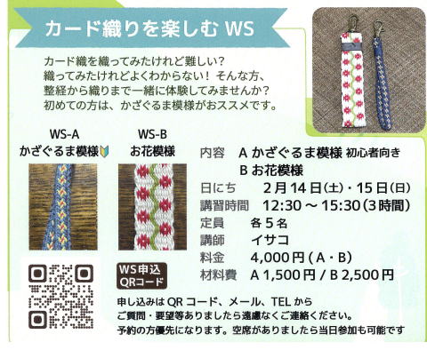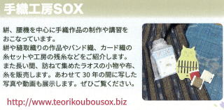 展示会・特別講習 手織工房SOXの手仕事展2026 2月12日(木)~15日(日) 12日(木) 14:00~18:00 13日(金)・14日(土) 10:30~18:00 15日(日) 10:30~~16:00 ギャラリー永谷2 180-0004 東京都武蔵野市吉祥寺本町1-20-1 チラシダウンロードはこちらから soxtesigoto2026.pdf へのリンク バンド織で楽しむ 浮織り模様 in そめなや 11月 1日(土) WS会場 天然染料の染め屋 そめなや 👇チラシPDFのダウンロードはこちらから soxwssomenaya.pdf へのリンク 世界中で織られている浮織りの紐を、可愛いネコのバンド織道具を使って作ってもませんか? 織り方はとてもシンプルで簡単。初めての方でも楽しみながら織ることが出来ます。 経糸が21本と多いので模様の組み合わせも自由に選べオリジナルの紐が織れます。 色も自由に組み合わせられます。 完成した紐はキーホルダーやストラップになどにアレンジできます。紐作りの楽しさを「バンド織」で体験してみてください。 講習時間 10:00~12:30 13:30~16:00 参加人数 5名 参加費 7,700円 材料費込み 講習のお知らせ 夏期講習 2026年 予定 ラオスの織りを楽しむ夏!1 お申し込みの際 お名前・参加希望講習・講習日・連絡先をご連絡ください。 kuroneko-sox@teorikoubousox.biz TEL080*2093*6496(工藤) 申し込みはこちらから ラオスのムックを織る -高機- ラオスの伝統織な織物「ムック」 経糸を浮かせて模様を織り出す技法です。 この織はシンと呼ばれるスカートなどに使われています。 講習では模様を作るための紋綜絖の取り付け方から 実際の織りまでを学びます。 南ラオスの小花模様を織る -腰機- 南ラオスで織られている小さなお花模様を織ります。 模様の綜絖と3本の中筒を使って模様を織り出します。 整経から織りまでを通して学びます。 詳細は2026春にアップします。 腰機コース 高機コース 南ラオスの小花模様を織る ラオスのムックを織る 東京スピニングパーティー 2025年10月18日(土)・19日(日) 斎藤機料さんのブースのお手伝いに行ってきました。 公式サイト:http://tokyo-spinningparty.org/ 懐かしい顔に沢山会えて楽しかったです!! お手伝いに誘ってくださった斎藤機料さん ありがとうございました 今までのWS これまでに開催してきたWSの記録です。 様々なテーマで企画し。多くの方に参加して頂きました。 それぞれのWSの内容や作品の写真をお届けします。 気になるWSの内容がありましたら、教室フリーレッスンで受講可能です。 気楽にご相談ください 今までのWS 木工部門 手織工房SOX・木工部門は、織りで使用する道具を製作しています。 使いやすい道具を幅広く展開していきます。 道具のオーダーもいたします。気軽にご相談ください。 通信販売を始めました 木工製品のご案内|手織工房SOX| 製品は吉祥寺教室・2週目ミアザのショップで販売しています。 ぜひご覧ください。